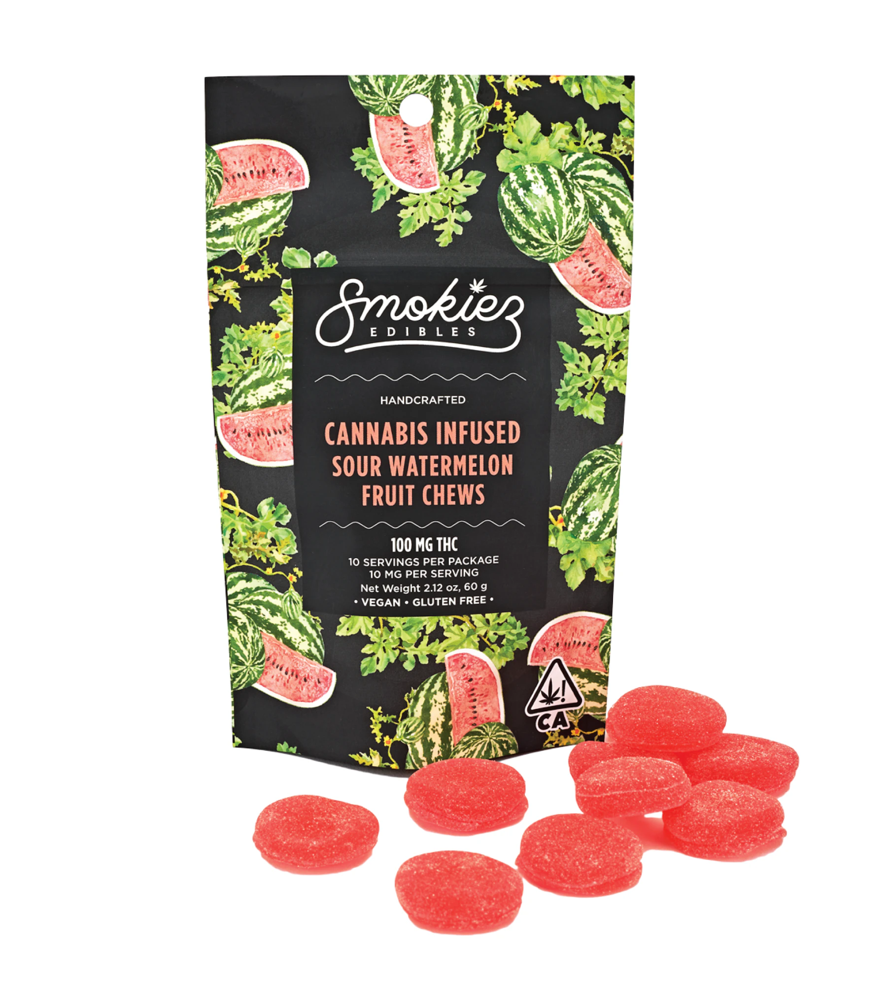 2024 SoCal Best Gummy Edible, Smokiez Sour Watermelon! Smokiez Sour Watermelon Hybrid Fruit Chews are NOT YOUR AVERAGE GUMMY™ These delicious fruit chews are a tasty and satisfying way for your customers to medicate! They are also Vegan, Gluten Free, Dairy-Free, and contain NO High Fructose Corn Syrup. Each of our mouth watering fruit chews contain 10 mg of THC, and made with our high clarity cannabis distillate for great taste. There are 10 pieces per package with 100 mg active THC per package.