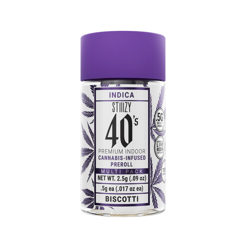 Elevate your preroll game with STIIIZY 40's infused prerolls. STIIIZY 40's start with .5 grams of our premium cannabis flower. Then we infuse that flower with our finest live resin and pack all that fire in a kief dusted cone. We name them 40's to emphasize their standout potency, with each infused pre-roll consistently showcasing a rich cannabinoid profile. But STIIIZY 40's are about so much more than just potency. Smooth, flavorful, and slow burning, STIIIZY 40's also set a new standard for quality in infused prerolls.